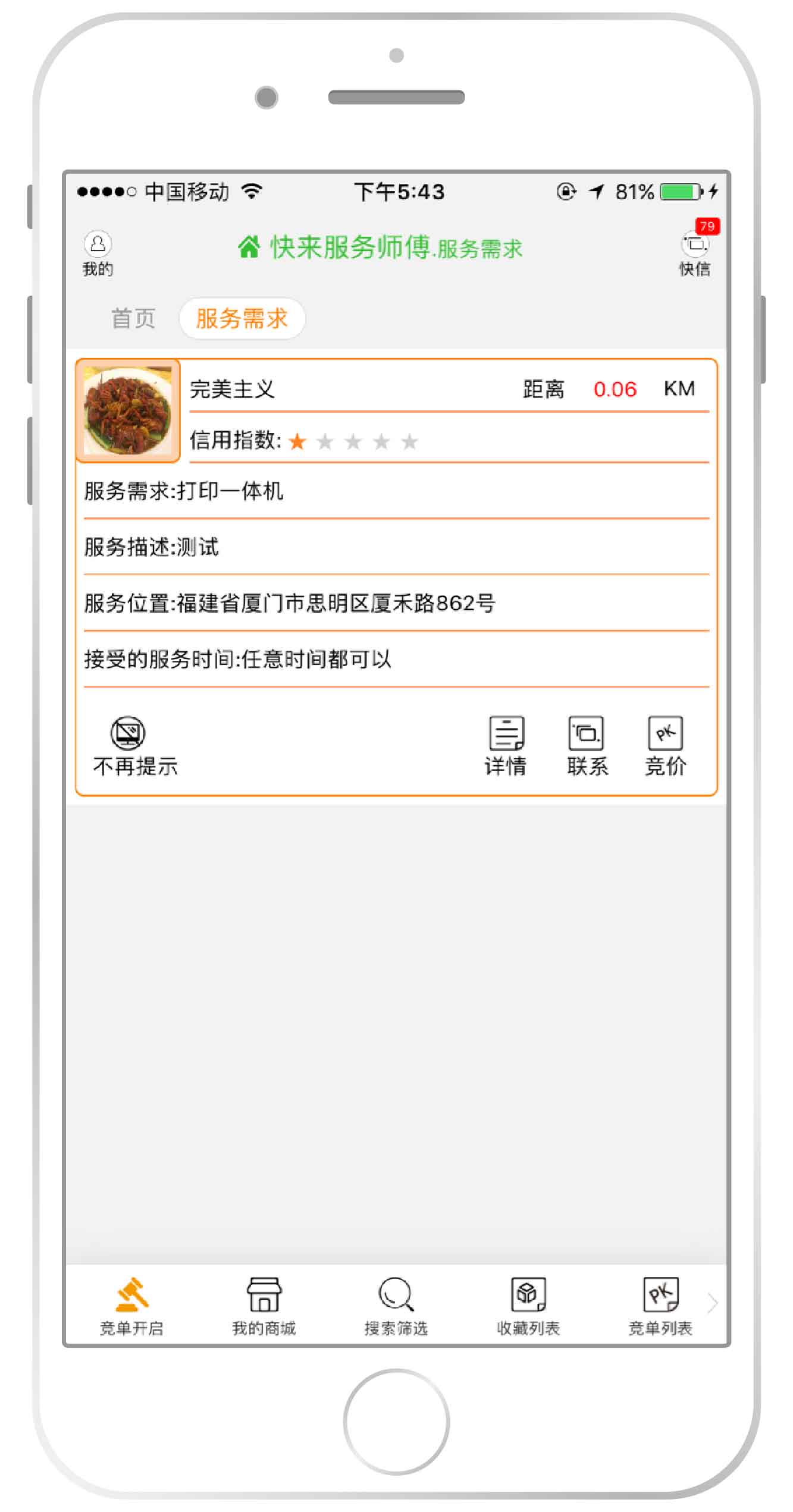 2.[信用指数]是客户在快来的信用,星星越多代表信用越高,信用高的客户师傅更愿意参与竞价哦。