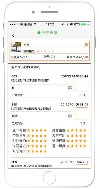9.[总满意度]是礼节礼貌、受尊重度、位置易找、客户守时、付款守约、维修环境、沟通能力、其它评价所得评分的平均值。